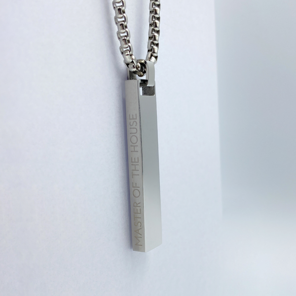 The pendant's bar measures 40mm in height and is suspended from a 58cm chain, making it the ideal accessory for wearing as a statement piece or layering with other jewelry.