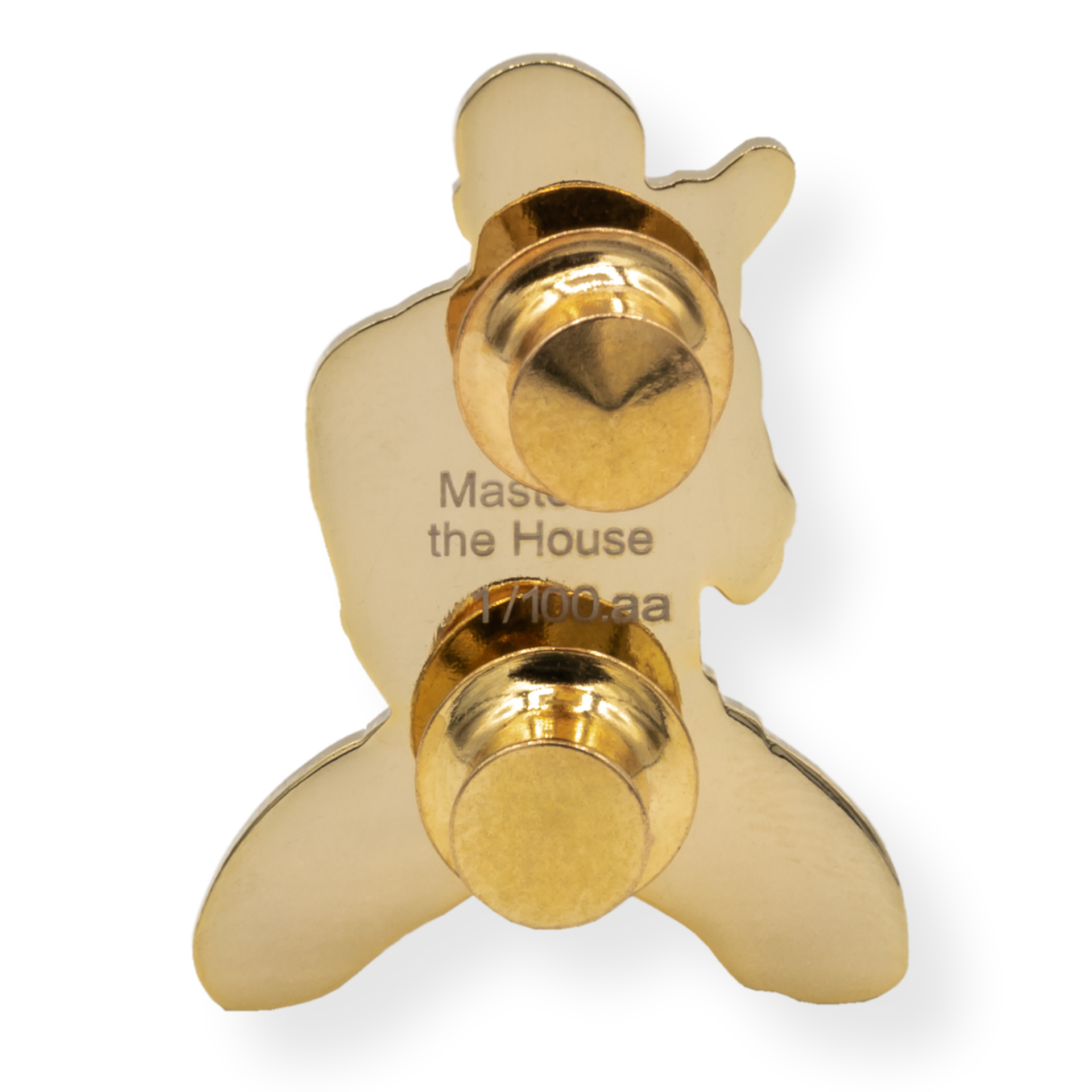 Hard enamel pin in gold tone and matte black detailing. It's 3,5cm high and has two safety closures. All pins have branding and a unique serial number laser-engraved on the back and are crafted in limited edition.