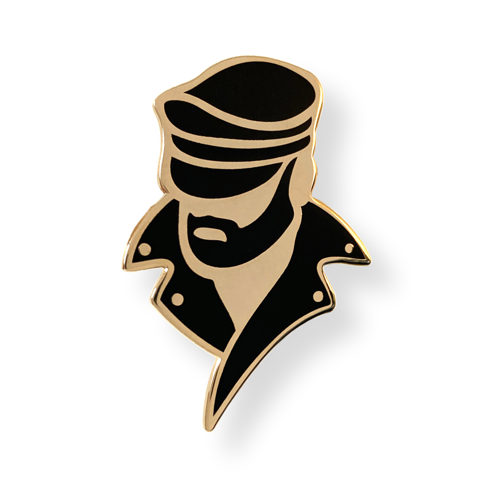 Hard enamel pin in gold tone and matte black detailing. It's 3,5cm high and has two safety closures. All pins have branding and a unique serial number laser-engraved on the back and are crafted in limited edition.