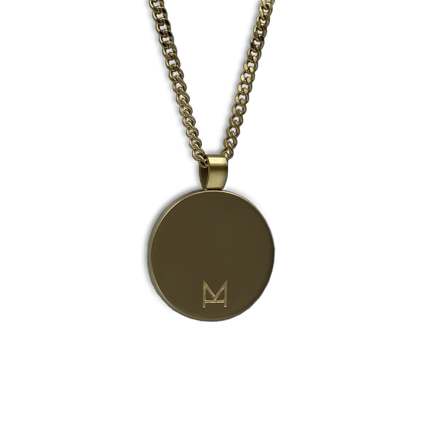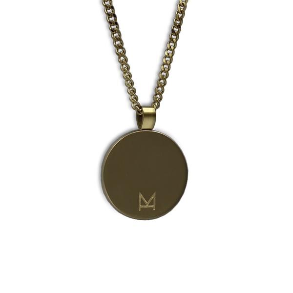 A pendant inspired by Roman coins, featuring a blind folded man waiting in anticipation to fully surrender. 'Dominus Domus' is Latin for Master of the House. Crafted from high grade stainless steel with a 18K gold plating, brushed matt finish.