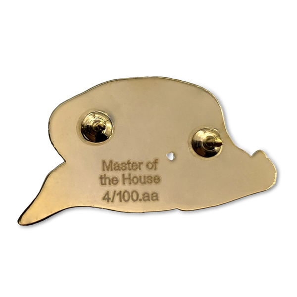 Hard enamel pin in gold tone and matte black detailing. It's 2,5 cm high and has one safety closure. All pins have branding and a unique serial number laser-engraved on the back and are crafted in limited edition. Comes with faux leather pouch for safe keeping.